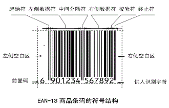 EAN-13条码符号由左侧空白区、起始符、左侧数据符、中间分隔符、右侧数据符、校验符、终止符、右侧空白区及工人识别字符组成,见下图。